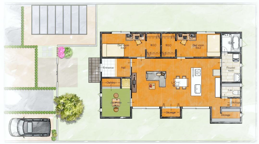 【川越市小中居】狭長地で叶えた中庭付き1.5階建て平屋のゆとりある暮らし 全館空調×太陽光発電で、家族の健康にやさしいサステナブルな住まい—鶴ヶ島展示場―