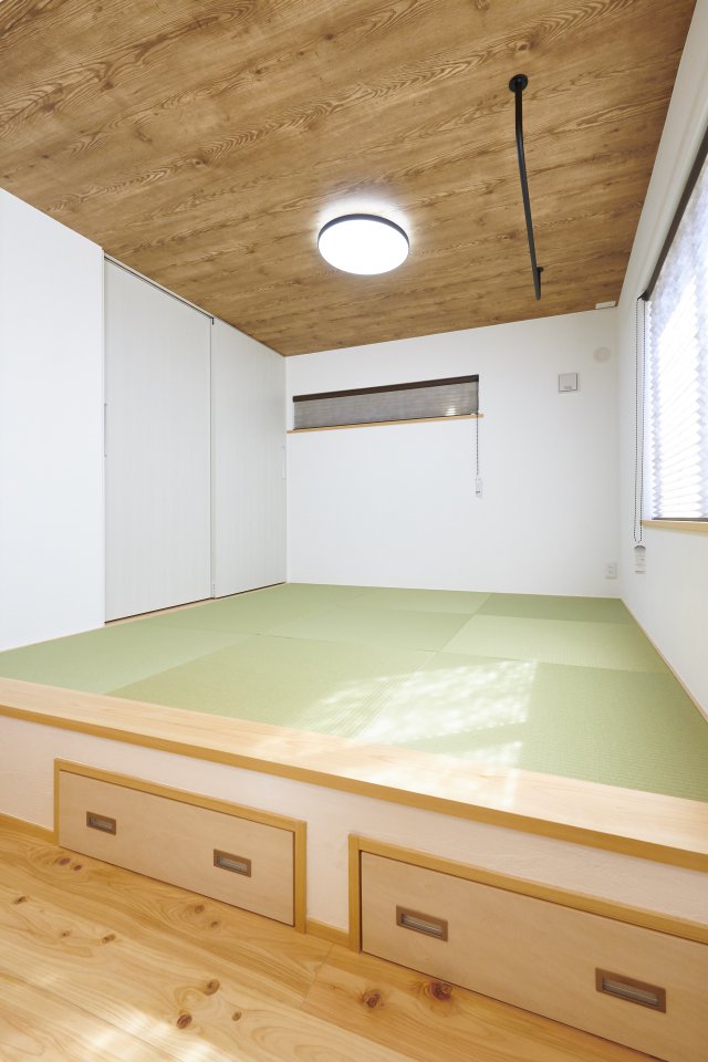 4.5帖のリビングとつづく小上がり畳コーナーは、家事、育児、趣味、応接間など多目的に使える。暮らしに畳があるだけで心がほっとするインテリアに。