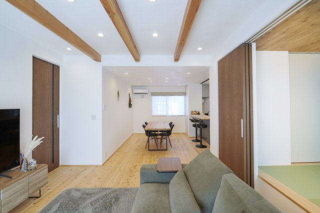 通常より30cmほど上げたリビングの天井で、心にちょっとゆとりが生まれる。化粧梁と組み合わせた高天井は開放的で温かみのある癒しの空間に。