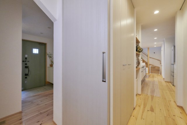 キッチン・ファミクロ・パントリー・水廻りという生活の中心をすべて回遊できる動線は、朝のお出かけから帰宅までが考え抜かれた設計に。