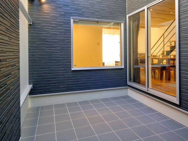 コの字の住まいの中心にはタイルデッキの中庭が広がります。使い方自由自在のタイルデッキで非日常を味わえる特別な住空間を実現しました。