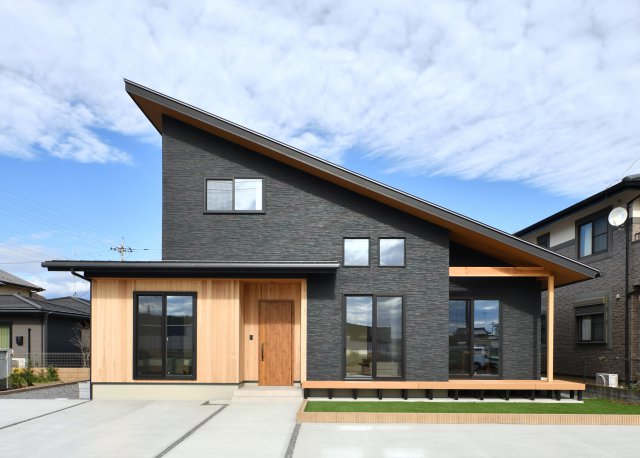 黒を基調とした片流れ屋根が印象的な外観。