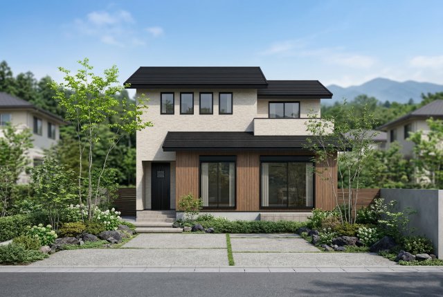自然素材感のある外観でどこにでも馴染むファサードデザイン。水廻りの効率的な動線と広々バルコニーで暮らしが豊かになる住まい。
