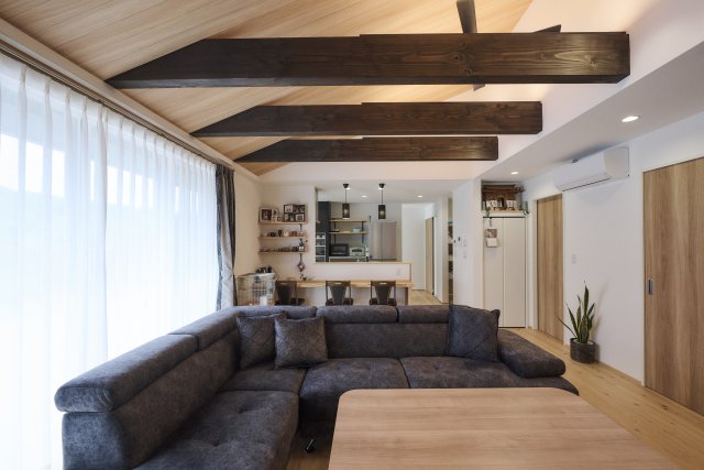 約25坪の広々LDKは掃き出し窓に向かって流れる勾配天井に。視線が窓の外のタイルデッキへと自然につながることで庭の景色もリビングの一部として取り込める設計に。