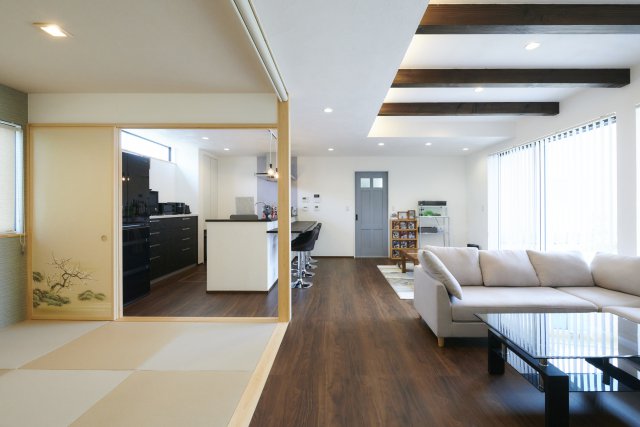 子育てや休日のお昼寝に大活躍の畳コーナーが隣接した約20帖の広々LDK。空間のアクセントに化粧梁を取り入れた自然と家族が集う温かみのあるリビングが魅力。