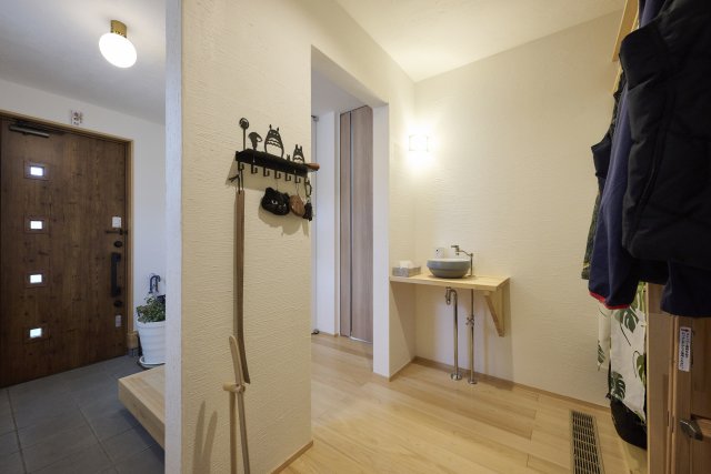 玄関を入ると、ホールには“ただいま手洗い”が。帰宅時にウイルスや花粉などを室内に持ち込ませない衛生的な動線を実現しました。