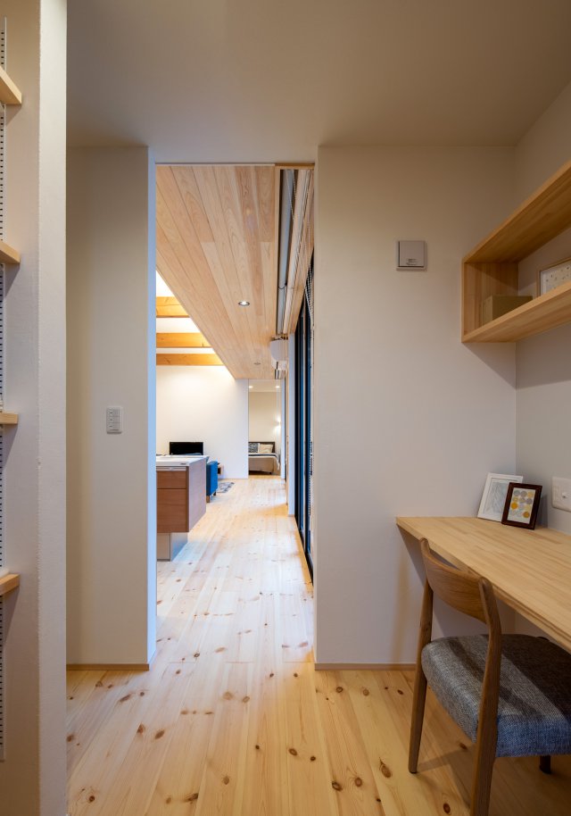 コの字型の間取りを活かして、ワークスペースと寝室スペースを分けることで、物理的に仕事モードをON・OFFできるライフスタイル設計を実現。