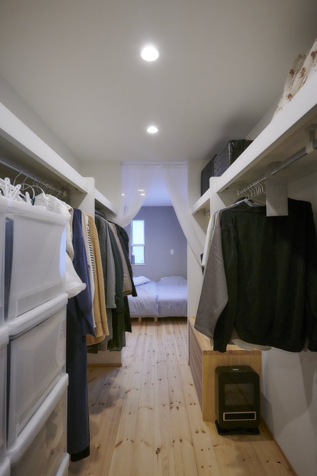 2Fの主寝室の隣には、4帖の広々WICと3帖の納戸が併設。オシャレな服を沢山しまえて、防災備蓄も置ける抜群の収納力。
