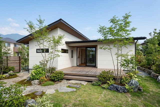 開放感あふれる高天井LDKに、テラスとつながる心地いい住空間。分離された水回りと豊富な収納を備えた、暮らしやすさを追求した平屋の住まい。