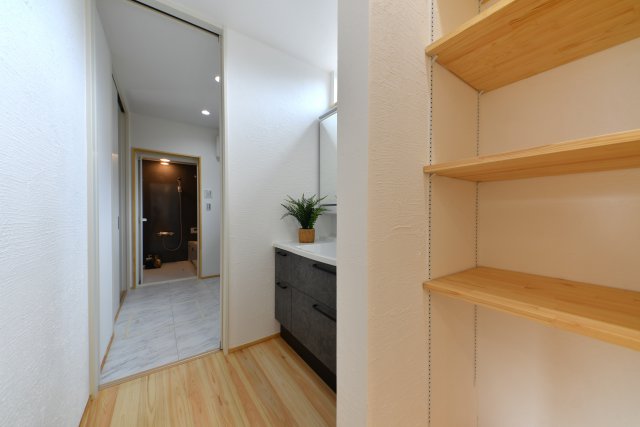 トイレ、洗面、脱衣・風呂が一直線になった水廻りは、家事ラクを叶える快適動線に。洗面と脱衣を分離することで、朝や夜の混雑も解消。