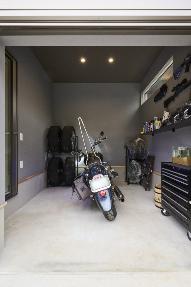 玄関直通のインナーガレージは、自転車が3台ほど置ける室内駐輪場に。自転車やバイクを野ざらしにせず保管できる便利な電動シャッター付きのスペースです。