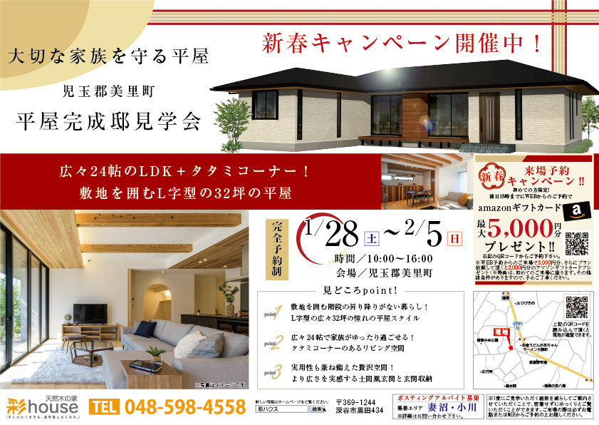 【児玉郡美里町】平屋完成邸見学会開催!