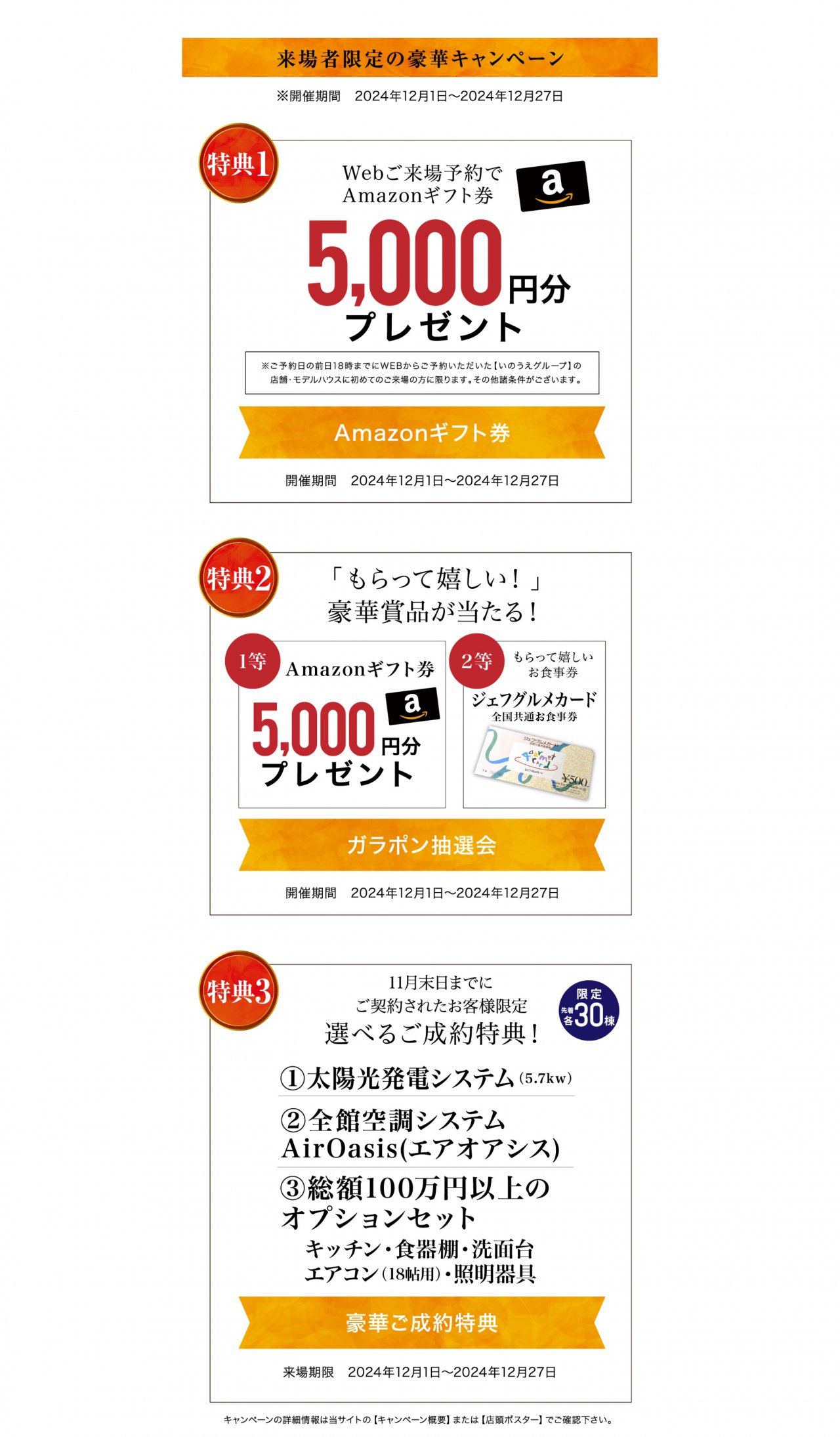 ※WEB予約からのご来場で3,000円分,さらにプラン依頼、敷地調査依頼、他展示場や完成邸のご見学など次回ご来場の場合は2,000円分のアマゾンギフトカードプレゼント。
