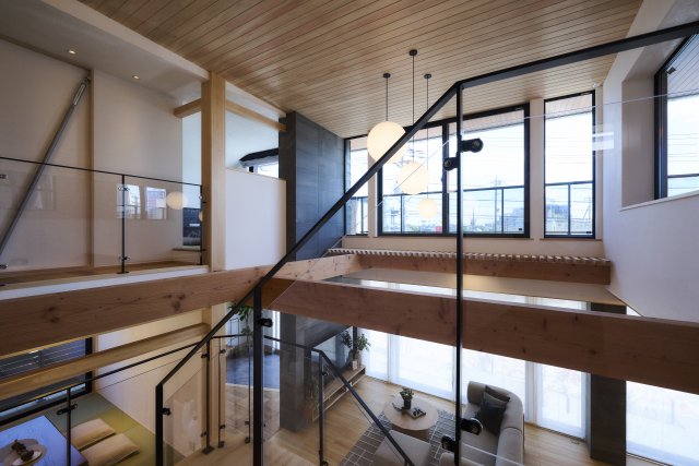 深い軒の外観が美しく、アクリル板アイアン手すりが