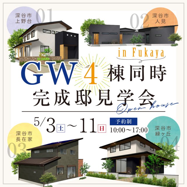 【深谷市】GW4棟同時完成邸見学会開催!~スタイルいろいろ、お好きな会場からお選びいただけます~