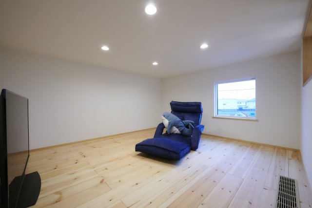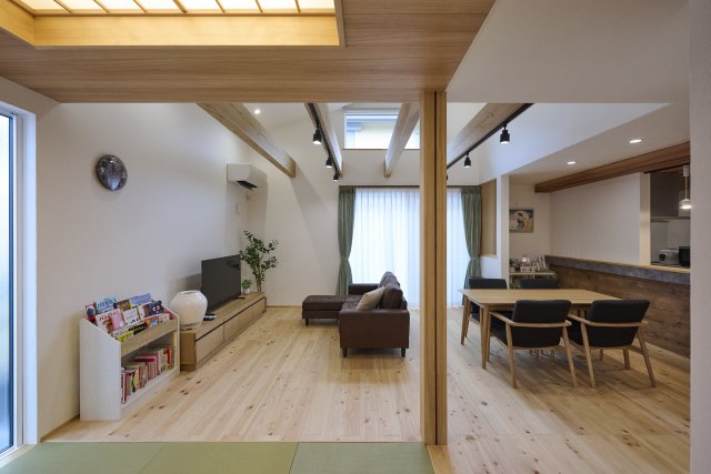 漆喰壁、無垢床、化粧梁、自然素材が包み込む、勾配天井が叶える開放感あるLDK。 リビングとつながる4.5帖の和室は、家事・育児・趣味・おもてなしなど多目的に使える癒しの空間。