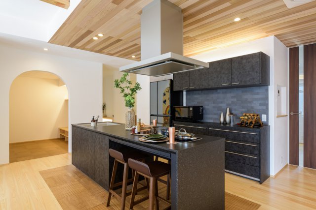 家族が集まるLDKでひと際目を惹くアイランドキッチン。