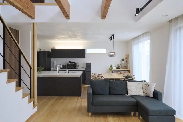 吹き抜けのある開放的なLDKには、2つの大開口窓から光が差し込み部屋全体を優しく照らします。