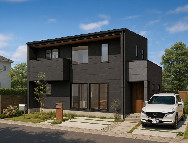 外観はコンクリート調のモダンスタイル、インテリアは白を基調にした自然素材の優しい空間に。