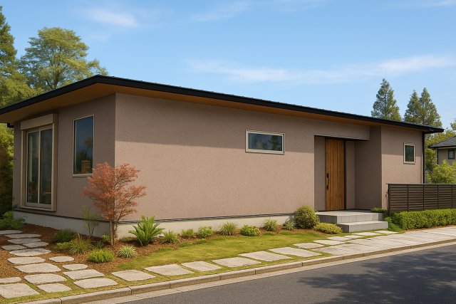 吹付外壁と木目軒天の素材感で魅せる長期優良住宅の贅沢平屋