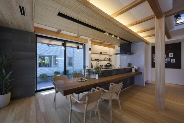 瓦の寄棟屋根と1点もののキッチンカウンターが上質さを醸し出す
