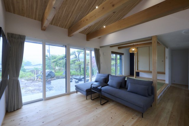 空間に広がりを生む勾配天井と化粧梁、家事が楽になる回遊動線、自然素材が叶える深呼吸したくなる平屋の家