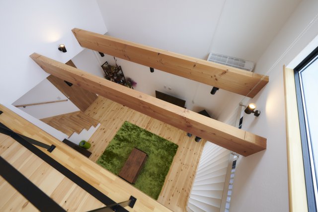 リビングの天井は開放感たっぷりの吹き抜けに。2Fにも光と風が吹き抜けるパッシブ設計に