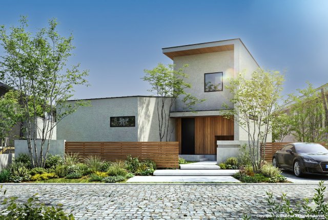 凹凸を活かしたBOXスタイルのモダンな外観はグレーを基調にし、アクセントとして随所に最高級デザインの木目調外壁や軒天を入れた意匠性の高いデザイン。