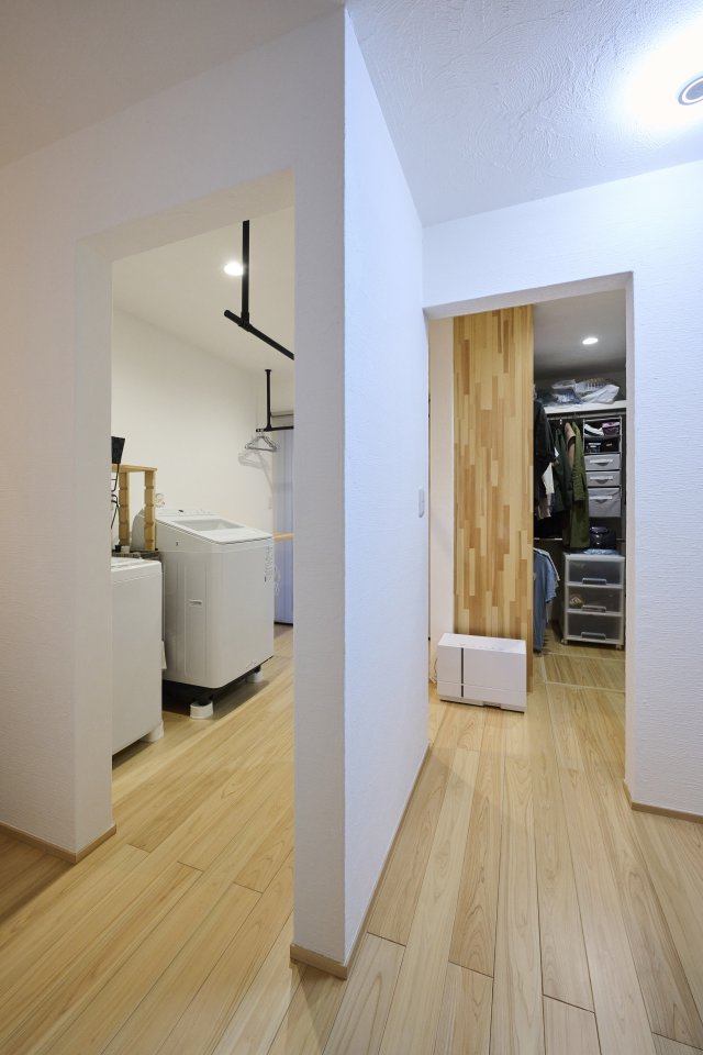 ランドリールームとWICが一体化した“最高効率の洗濯動線”を実現。洗う・干す・片付けるが空間内で完結。