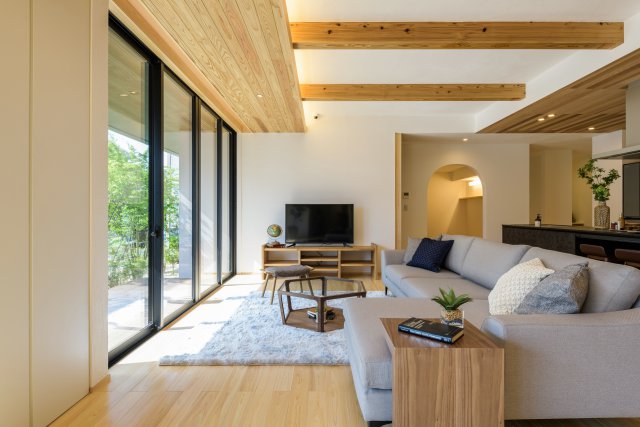 約23帖の広々としたLDK。大きな掃き出し窓を2つ設置することで部屋中に光と風が吹き抜ける。家族が自然と集まる心地の良い憩いの場所に。
