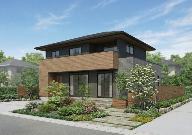 黒を基調とした外観は、凹凸部に木目やタイル調などのアクセントを貼り分けることで、より立体的かつ上質なファサードに。