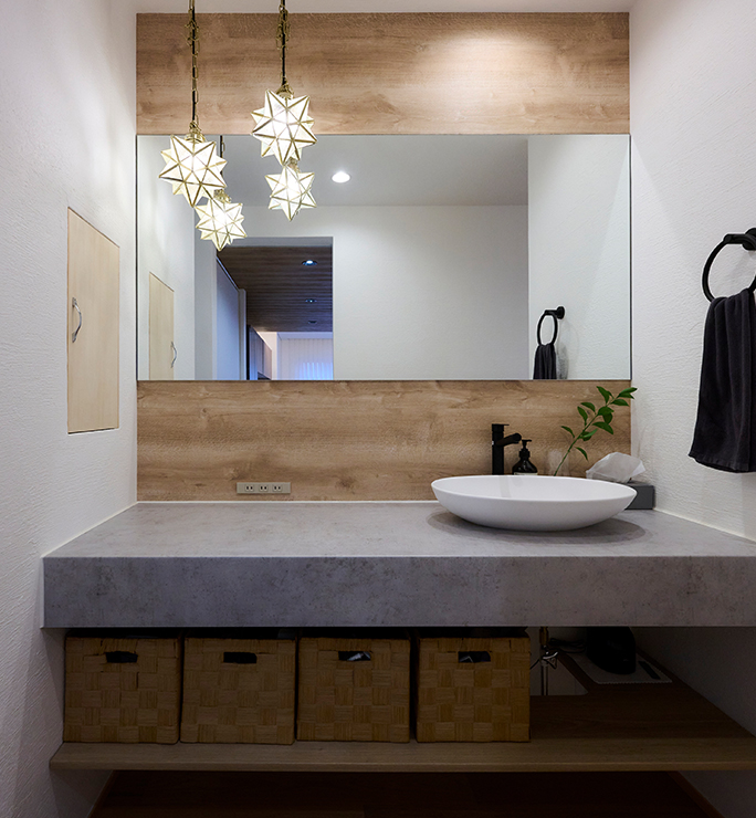 脱衣も家事もストレスなくできる広々としたランドリースペース。床材も水に強い物を採用し、それに合わせた壁紙も採用。細部にもこだわったインテリアも見どころの一つです。洗う・干す・畳むがひと空間で完結できる理想のランドリーができました。