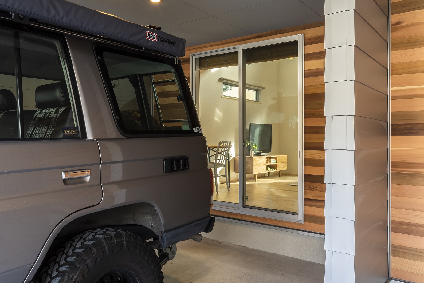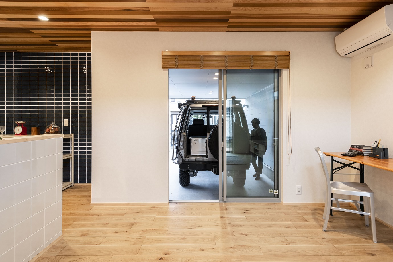 インナーガレージは、車好きの憧れの場所。愛車を眺めながら過ごせるガレージは、趣味を愉しむための特別な空間です。ガラス仕切りで室内から愛車を見られるデザインも人気で、ショールームのような演出も可能です。