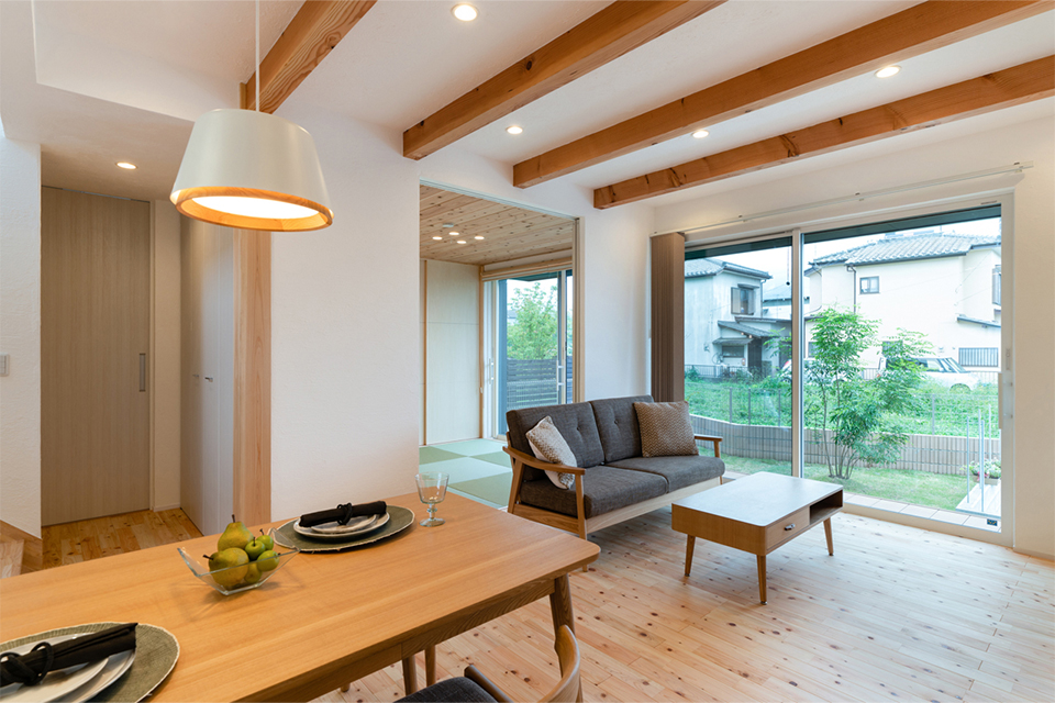 タタミコーナーのあるピアノリビング空間