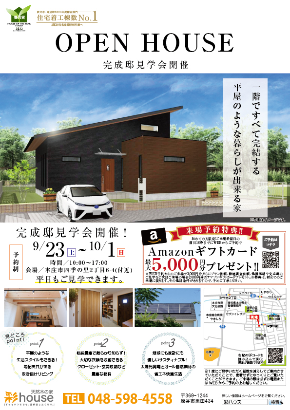 埼玉県の熊谷・上尾・東松山・深谷・秩父・本庄・久喜エリアで自然素材にこだわった高性能でプレミアムデザインの新築住宅をご提案している彩ハウス東松山展示場です。