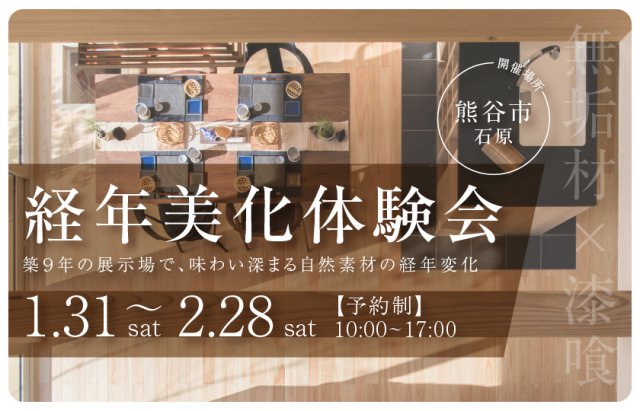 築9年の展示場で、味わい深まる自然素材の経年変化を見て、触れて、話して納得できる体験会を開催中!