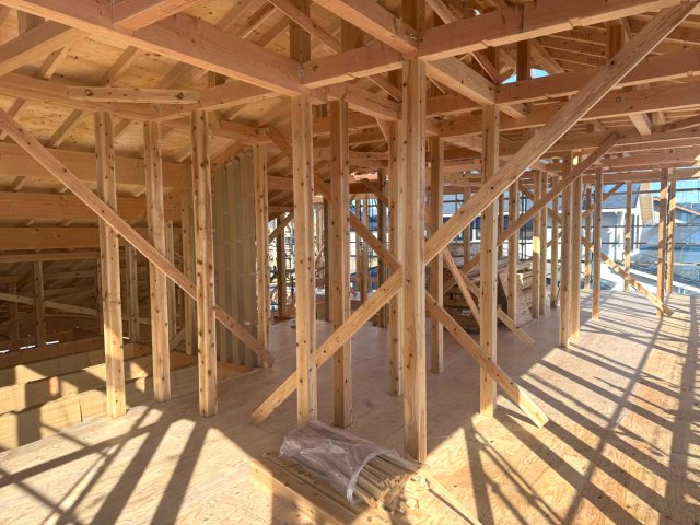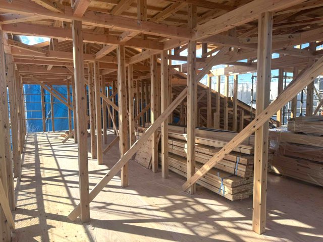 柱や梁が整然と組まれた様子から、安心感のある住まいづくりが着実に進んでいることが感じられます。