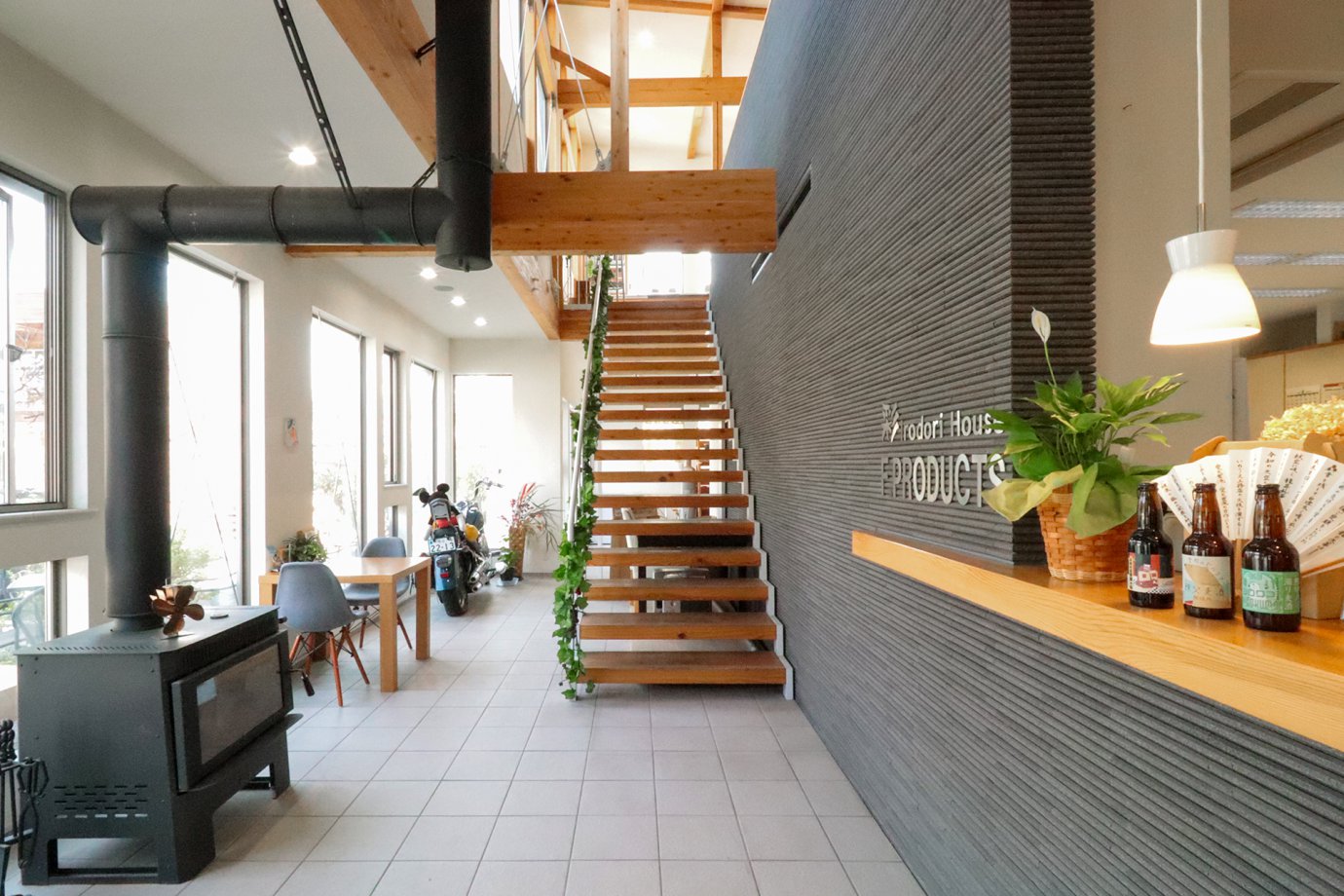 床のタイルの中には、秩父盆地の寒さを考えて床暖房の設置。大きな薪ストーブで優しい暖かさでゆっくりとした空間を奏でます。 -