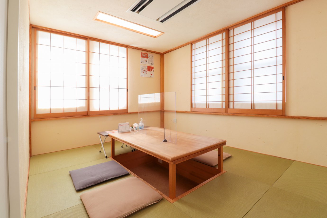 自然素材を使用した、落ち着いた空間の個室でお打ち合わせができます。こちらの和室からもキッズスペースが見えるので、お子様で連れのお客様も安心してお打ち合わせができます。