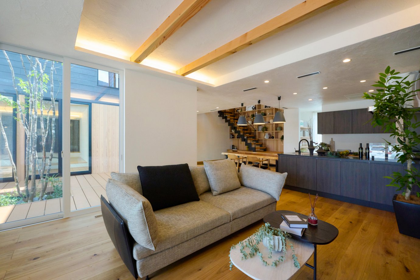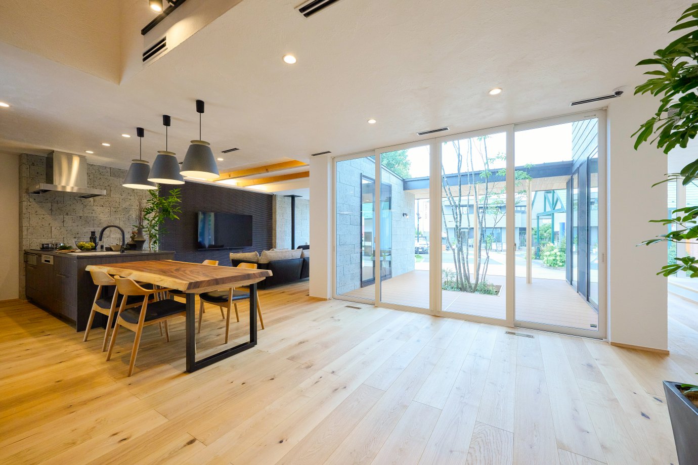 キッチンやダイニングからも中庭の緑を望めるよう設計された空間は、