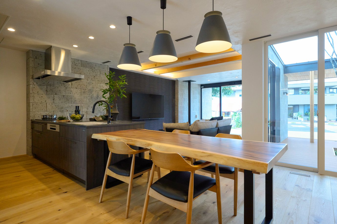 木目が際立つダイニングと、インテリア性の高い対面キッチン。