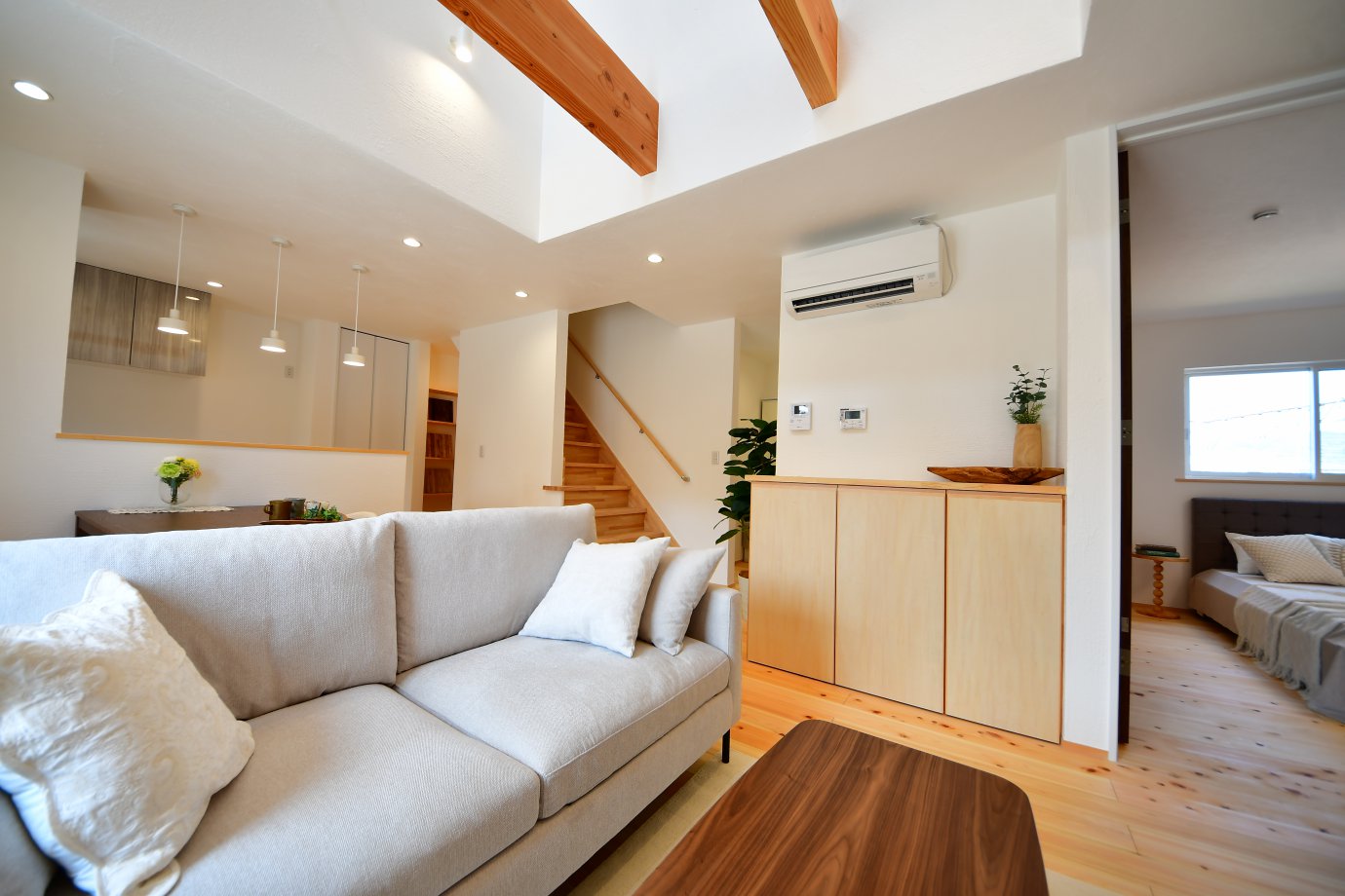視線を上に誘導する勾配天井と木の梁が空間に伸びやかさを与え、自然素材の温かみも演出しています。リビング全体に開放感をもたらし、日中の光がより一層柔らかく広がります。