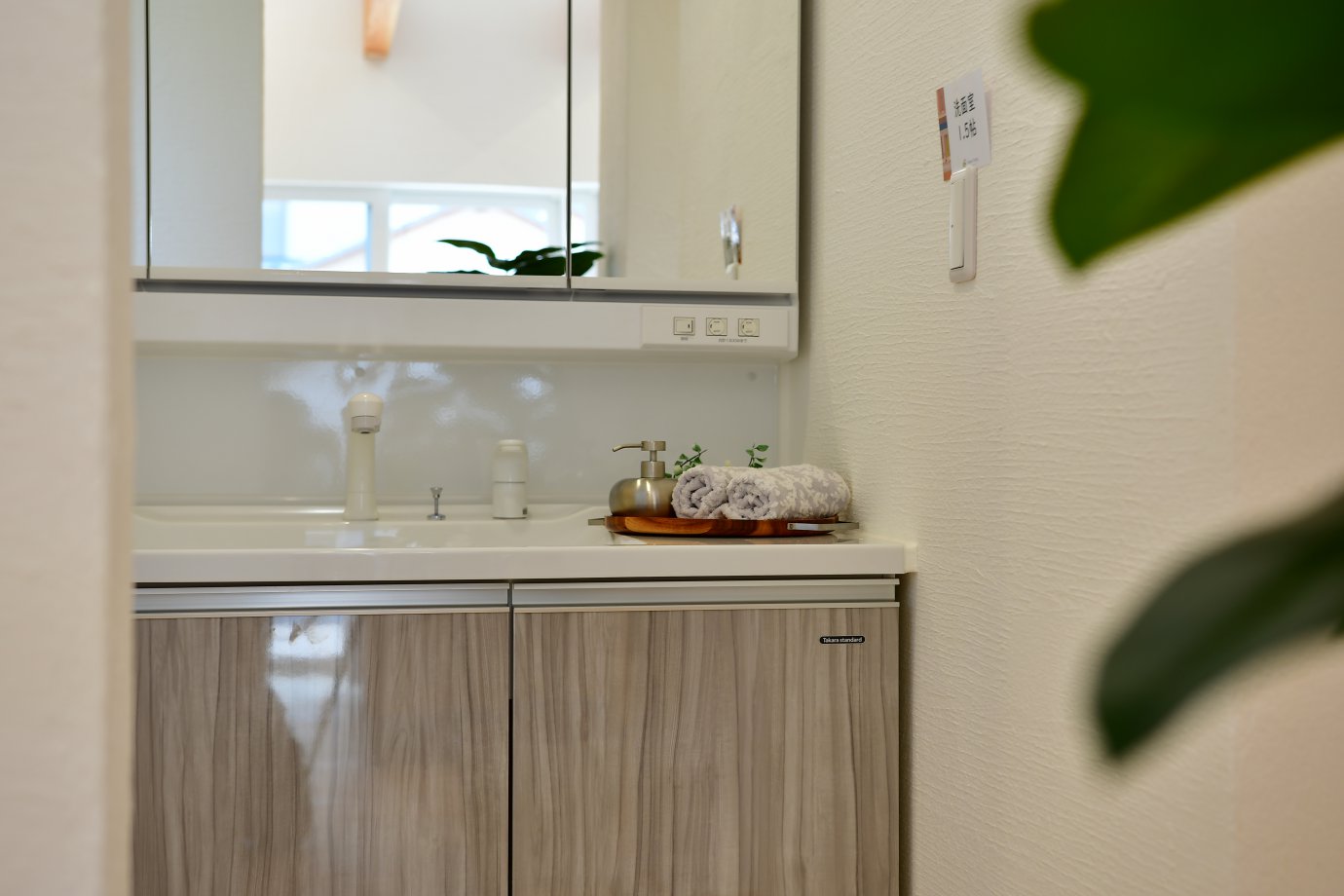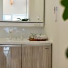 キャビネットは柔らかい木目調で仕上げられており、ナチュラルで温かみのある雰囲気を演出しています。リビングや床材との相性も良く、空間全体に統一感を与えています。