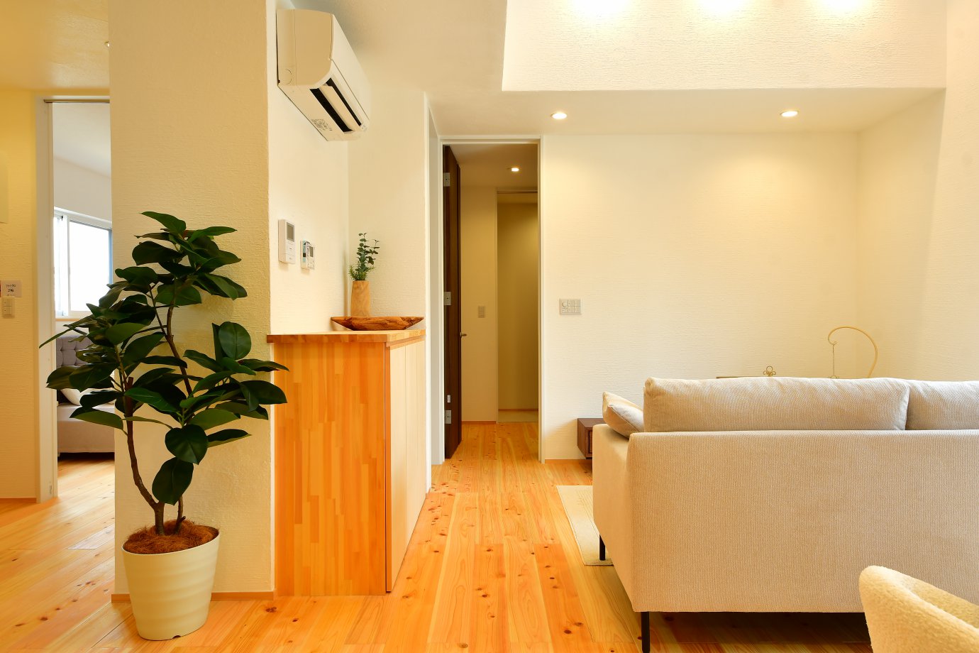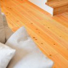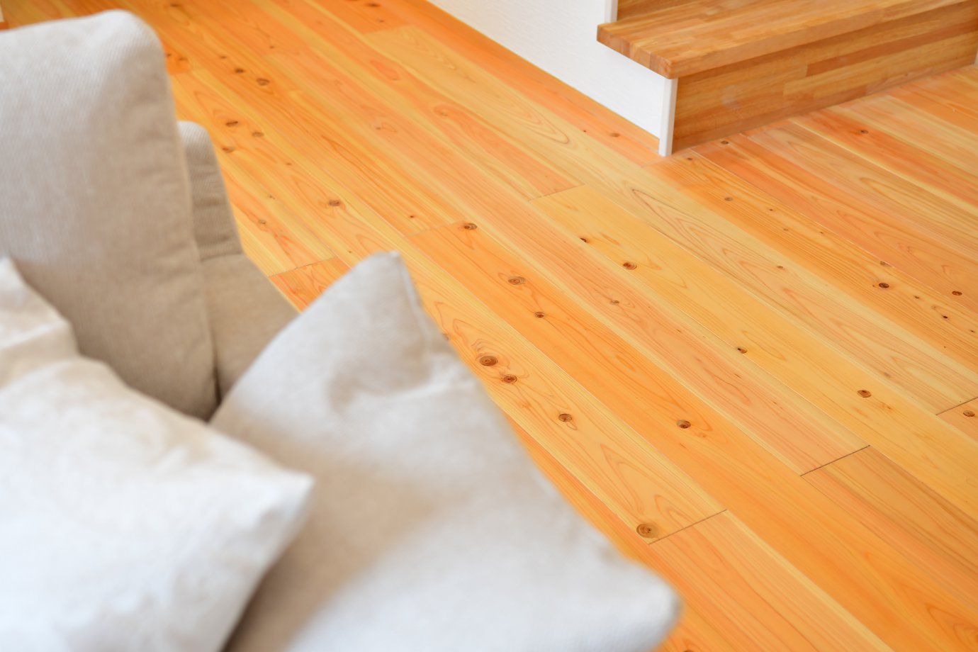 無垢材の美しいフローリングは、柔らかな木目と節の表情が特徴的で、天然素材ならではの温かみがあります。