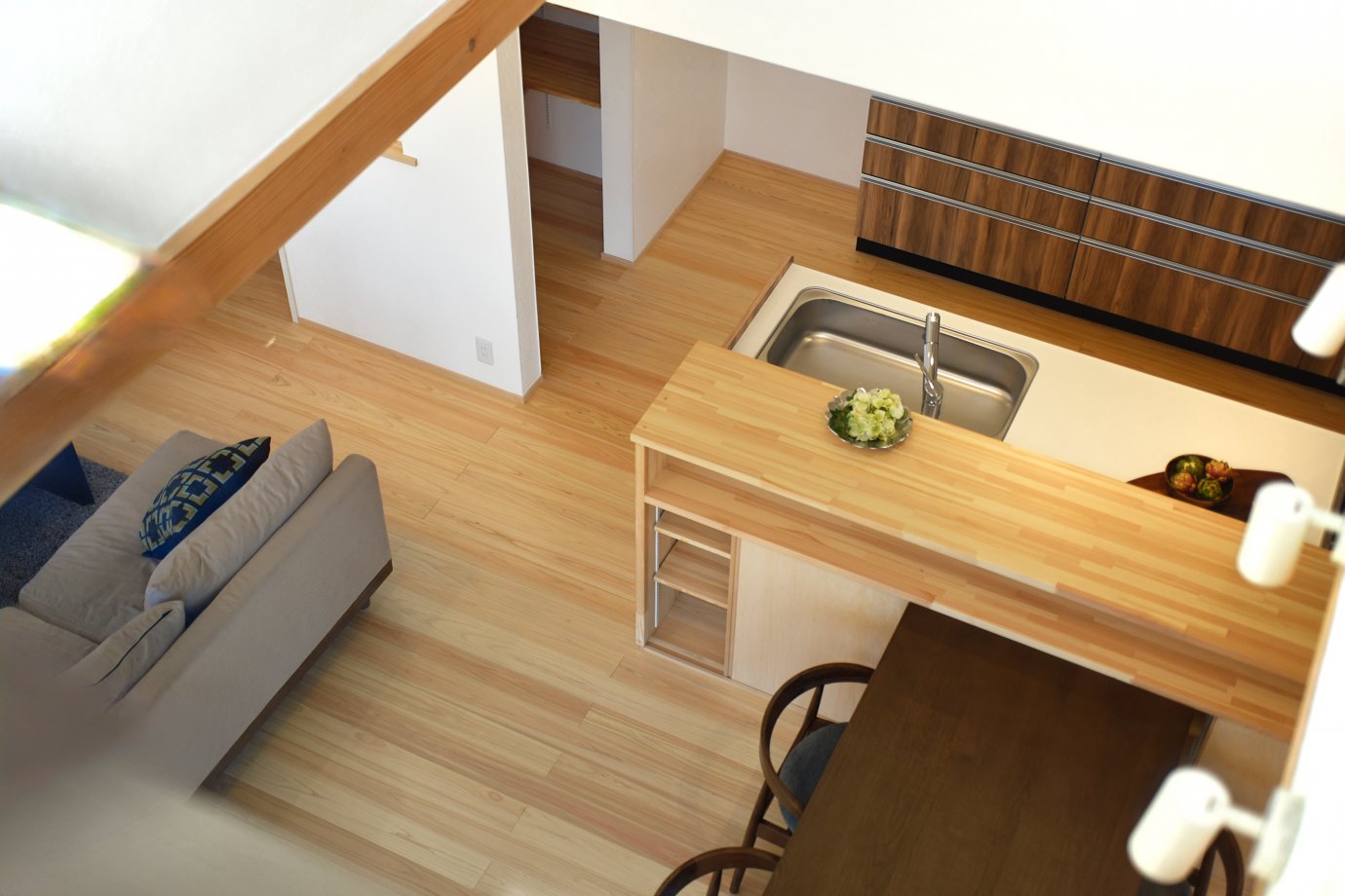 LDKの中心であるダイニングを吹き抜けにすることで、開放感のなかゆったりとした食事時間を届ける設計に。