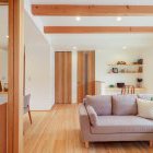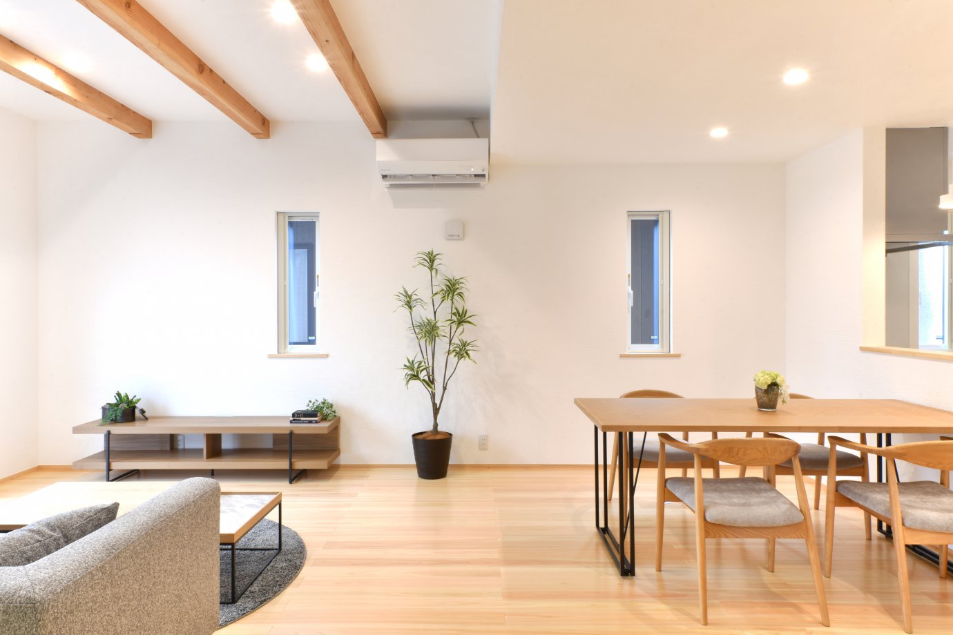 天井高2.7mの開放感に、天然木の化粧梁が映える。
