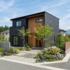 黒を基調としたモダンなファサードに、天然木のアクセント外壁や化粧梁を施すことで、いつまでも飽きのこないデザインに。