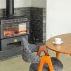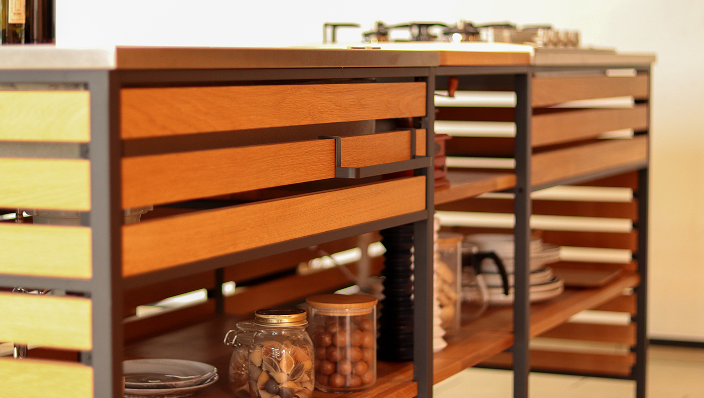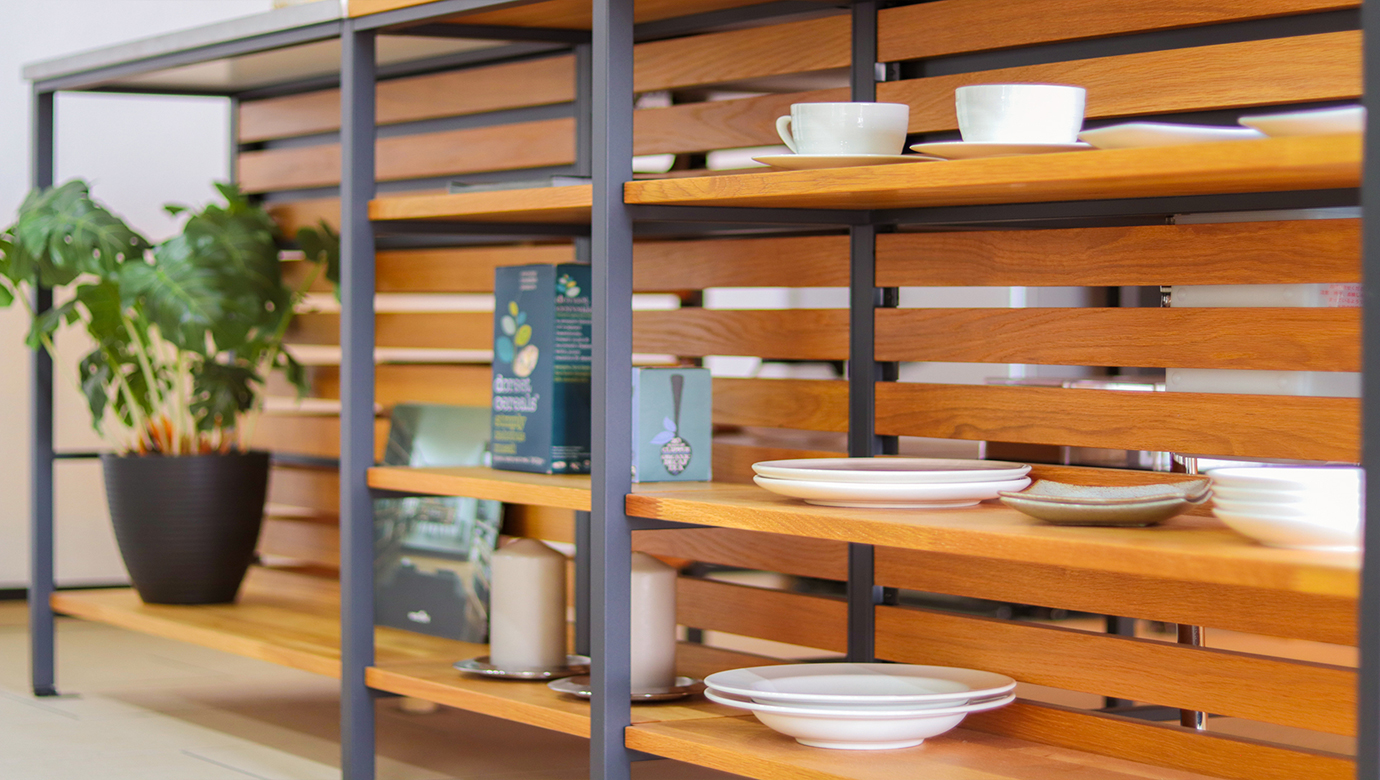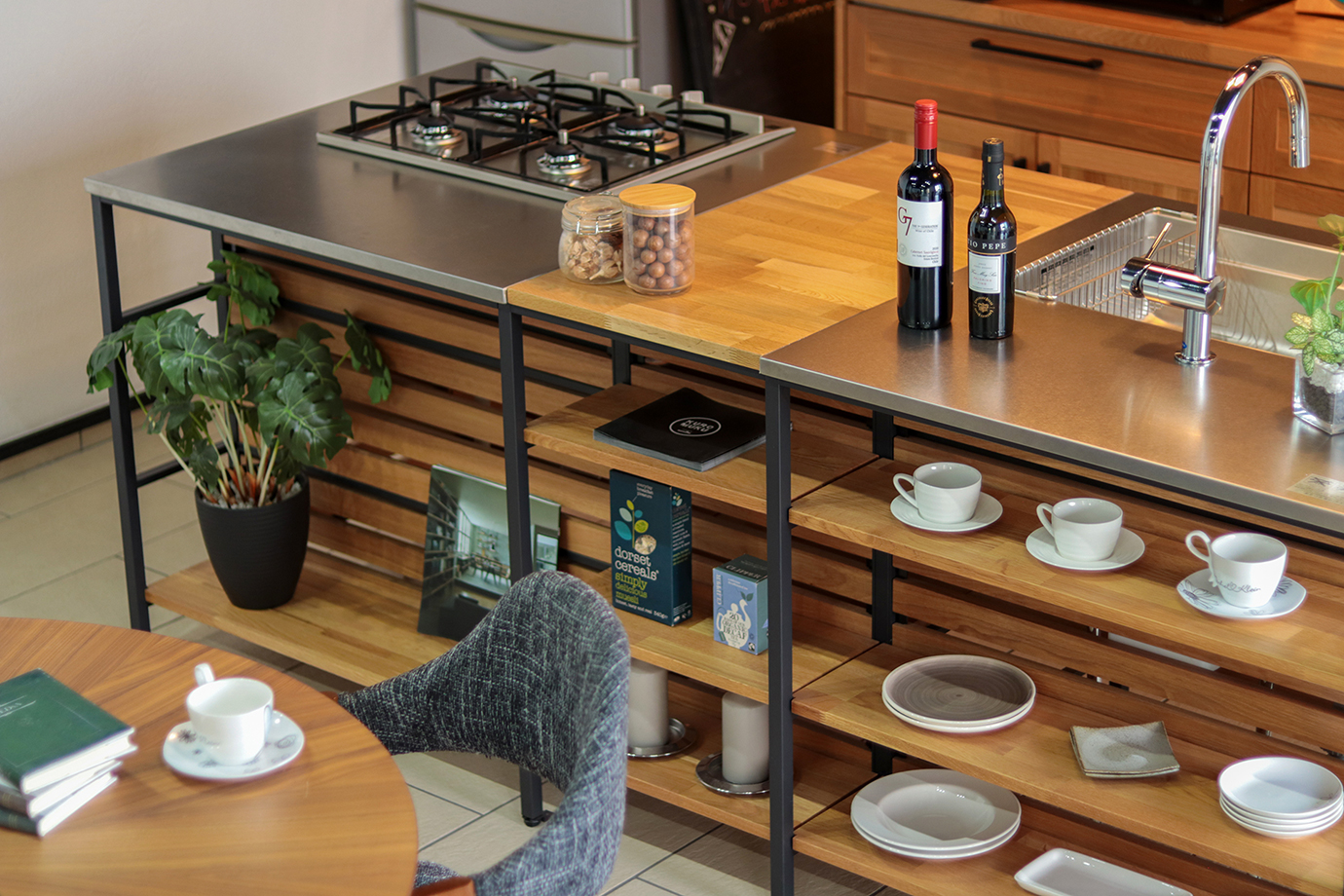 カフェのような居心地のよい展示スペース 黒の鉄と無垢の木の棚板を組み合わせたシンプルでスタイリッシュなフレームキッチン、炎を贅沢に楽しめる暖房面積の広い薪ストーブなど彩ハウスが考える「心も体も温まる居心地よい住まい」を体感していただけるような空間をつくり込んでいます。