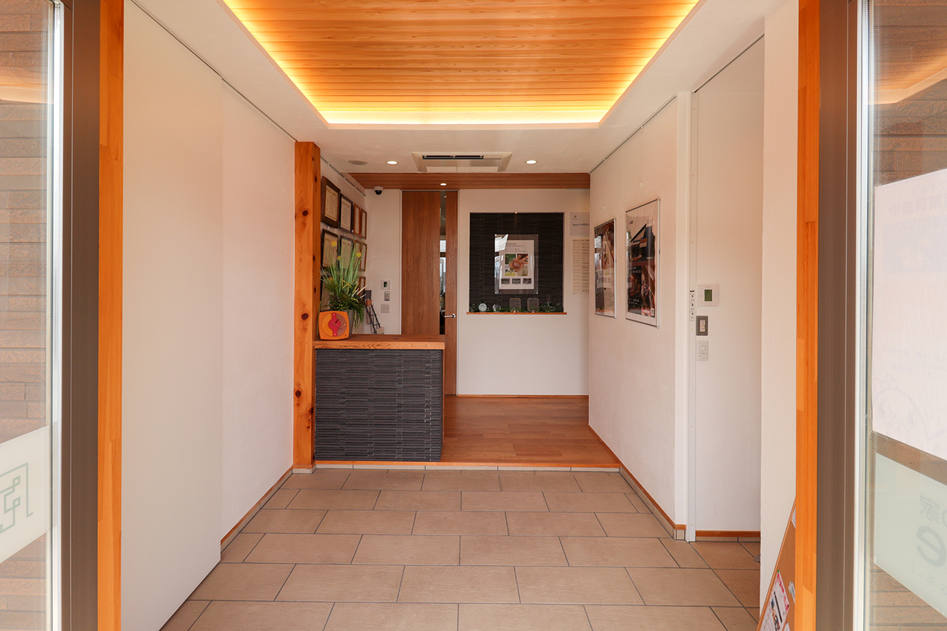 光が感じられるショールームエントランス 折り上げ天井の間接照明と玄関から差し込む陽の光が明るい雰囲気を演出するショールームエントランス。創業100年以上の匠の技術と漆喰の塗り壁が優しく包み込んでくれる空間を体感できます。お客様がご来店の際にはスタッフが明るく丁寧にお出迎えいたします。