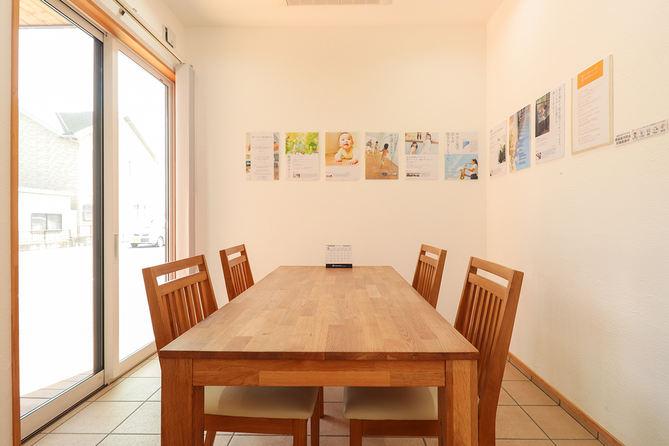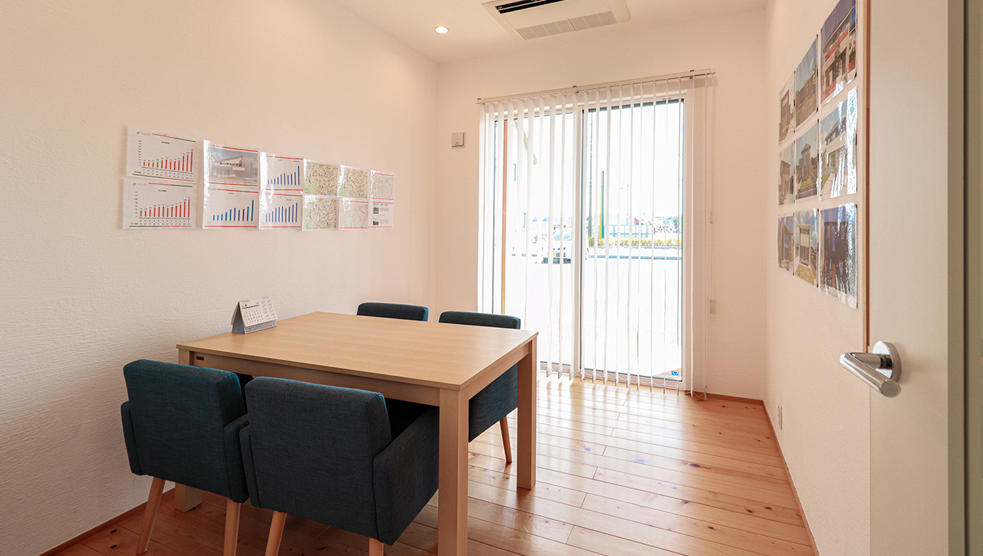 自然素材に囲まれたお打ち合わせスペース 漆喰の塗り壁や天然木のテーブルなど彩ハウスの家づくりに触れられるお打ち合わせスペースです。無垢の木などの自然素材のサンプルや彩ハウスがこれまで建ててきた自由設計のお家の事例などをご用意。お客様のお家づくりの不安や悩み、どんなご相談にもスタッフが親切丁寧にご説明いたします。ぜひ彩ハウス深谷店までお越しください。